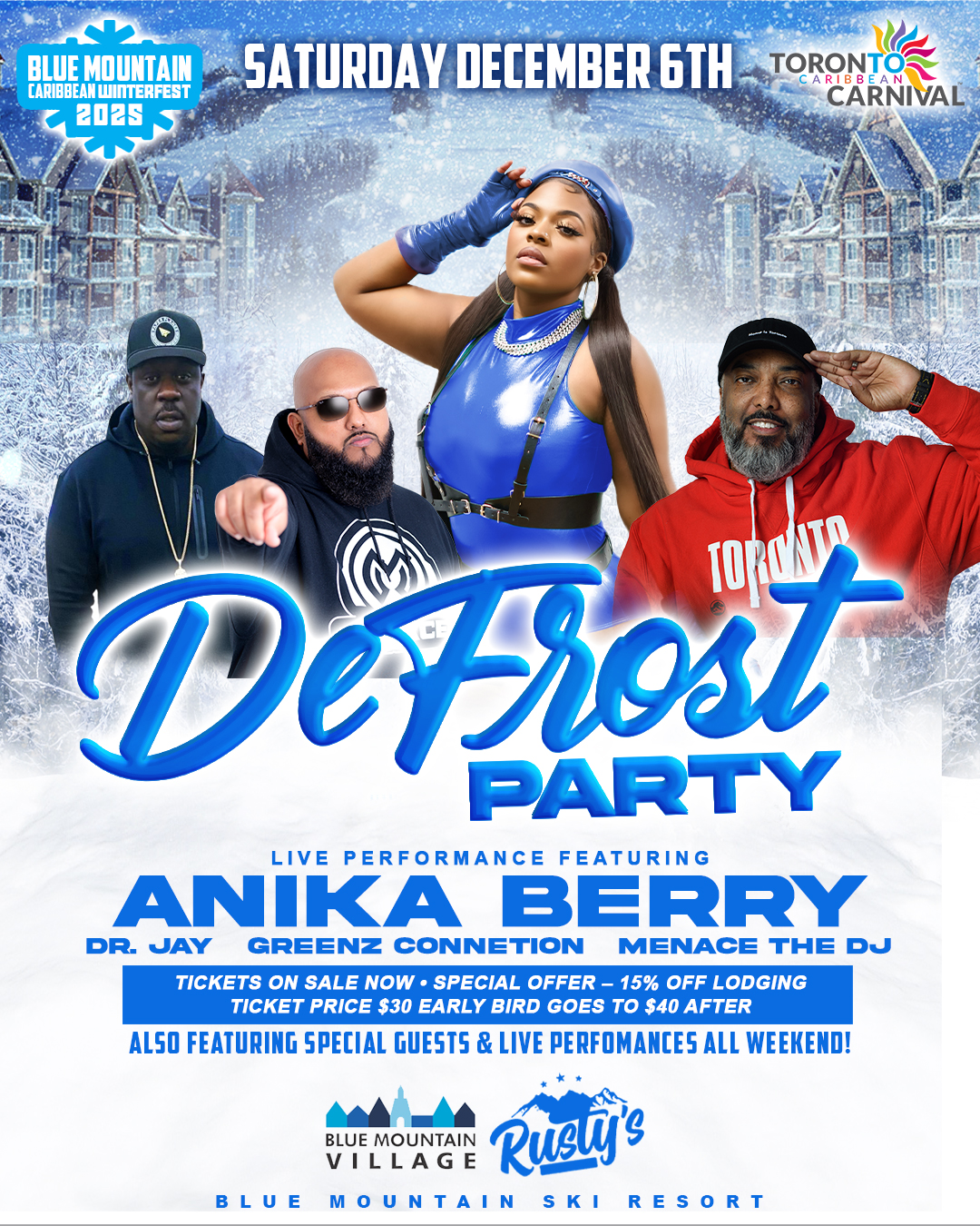 On Saturday, December 6, the celebration continues under the stars and holiday lights, with the Blue Mountain DeFrost Party, an electrifying event that blends all the sounds of the Caribbean with dazzling lights, live performances and the energy of a Toronto Carnival fête.