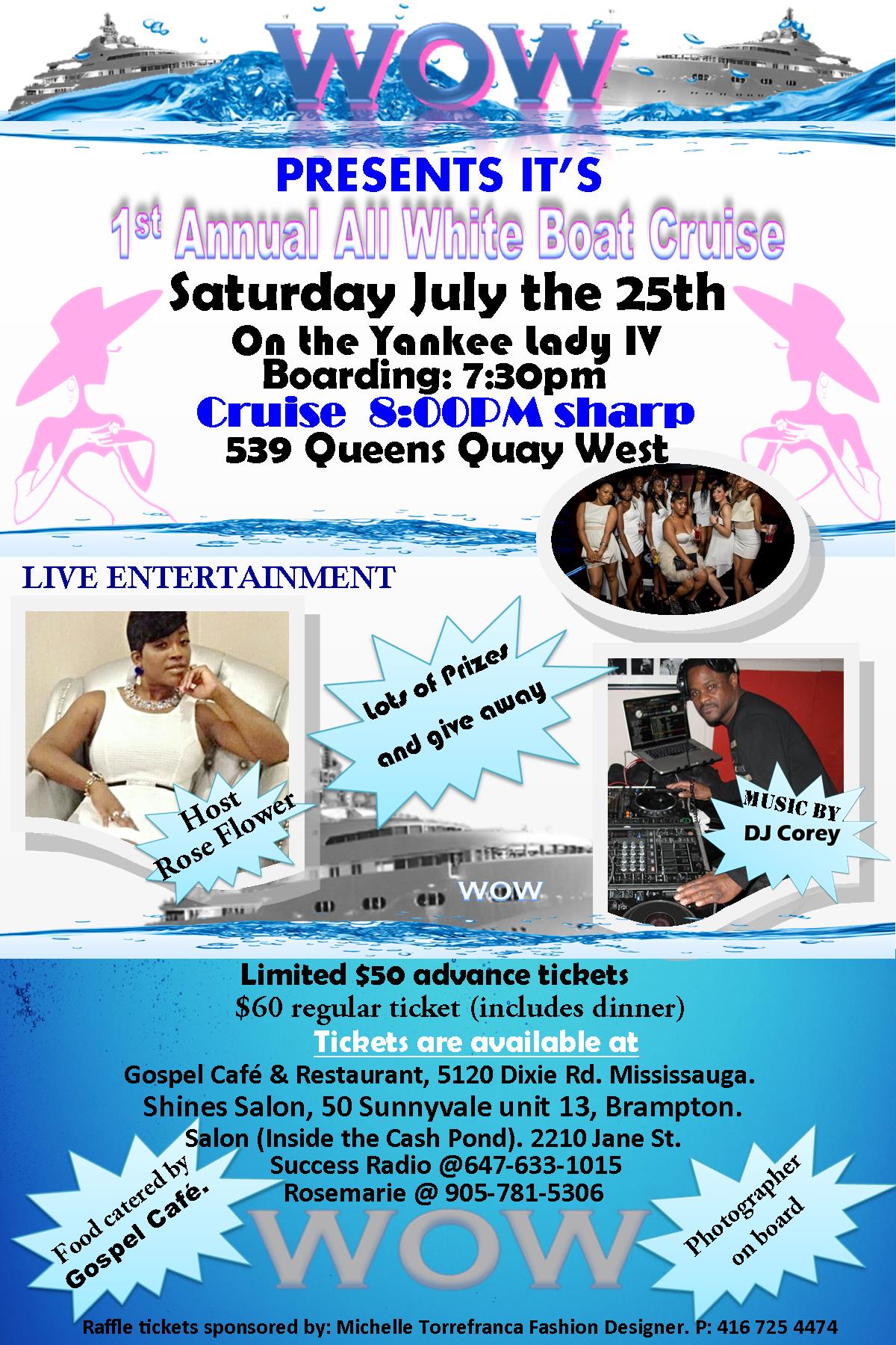 WOW All White Boat Cruise" We are celebrating the launch of my radio program "WOMAN OF WORTH" Come one come all and show case the essence of who you amonong beautiful women and men. Mature and classy enjoy the ambiance of great entertainment with singer Evangelist Natalie Palmer & Dee Lee with spoken words. Long side GTA best DJ Corey Hastings. Delicious food catered by the famous Gospel Cafe and restaurant, also our famous photographer will be  board capturing your special moments. please purchase your ticket now or at  any of our locations listed on flier or call me Rosemarie @ 905-781-5306. You Don't Wanna Miss It ~