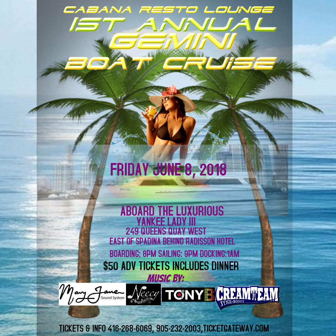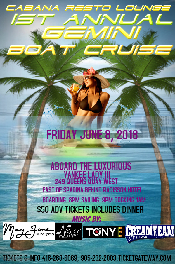 CABANA RESTAURANT AND LOUNGE LOCATED AT 1590 DUNDAS STREET EAST MISSISSAUGA IS PROUD TO PRESENT IT'S 1st ANNUAL GEMINI JUMP OFF ABOARD THE LUXURIOUS YANKEE LADY III ON JUNE 8 2018 TICKETS ARE $50 IN ADVANCE AND $60 AFTER DINNER IS INCLUDED AND PROVIDED BY CABANA RESTO LOUNGE. THIS IS A BOAT RIDE YOU DONT WANT TO MISS MUSIC SUPPLIED BY THE BIG BAD MARY JANE SOUND CREW ALONGSIDE DJ NEECY AND JYNX FROM CREAM TEAM FOR TICKET INFO CONTACT ANDREW 416-268-6069 OR CABANA 905-232--2003