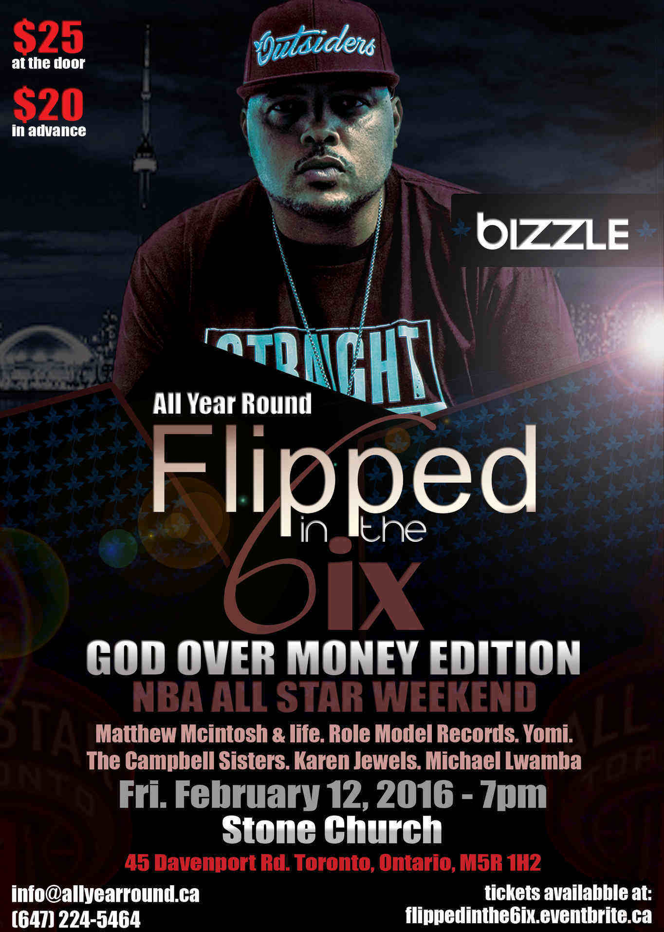 ALL YEAR ROUND presents "Flipped in the 6ix" NBA ALL STAR WEEKEND Headlined by God Over Money recording artist 'Bizzle' performing for the first time in Toronto. Other artists include Karen Jewels, Michael Lwamba, Matthew Mcintosh & LIFE, Yomi, The Campbell Sisters, and Role Model Records artists Julian, Shope, and Dru Bex.