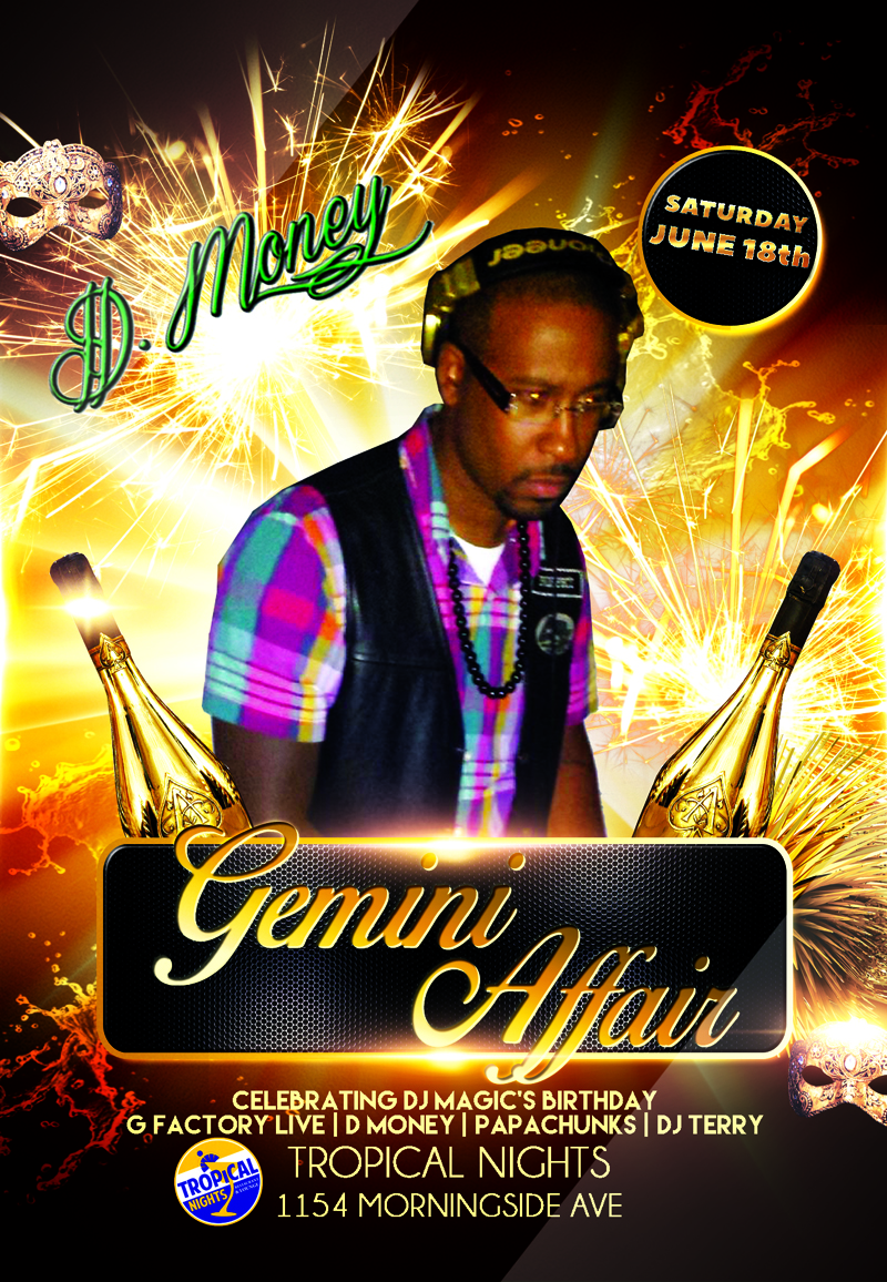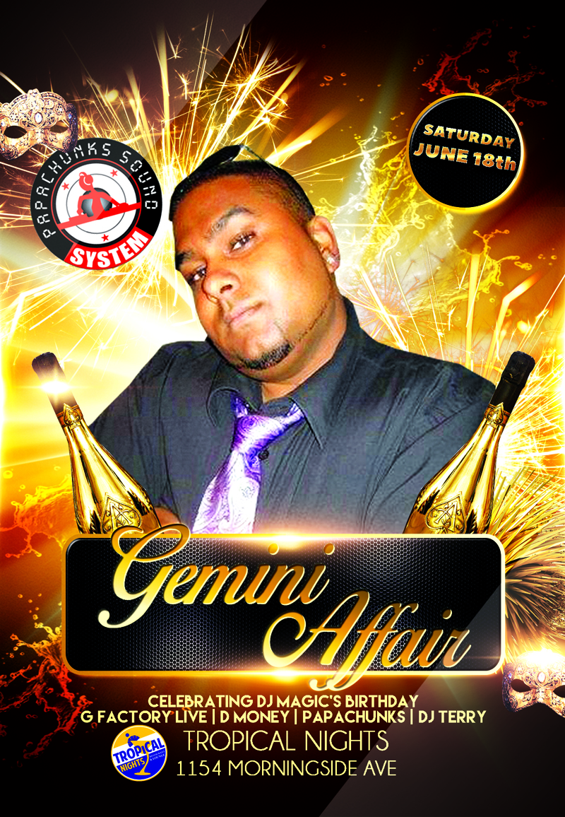 Secret Society In Presents The Annual Gemini Affair Celebrating Dj Magic's Birthday Featuring G Factory Live, Papa Chunks Sound System, D Money, Dj Terry, Hosted By R&B Sound Crew FREE ADMISSION ALL NIGHT LONG FUEL SPECIALS & MUCH MORE 19+I.D A MUST SECURITY INFULL EFFECT INDOOR / OUTDOOR EVENT HUGE ROOF TOP PATIO @ TROPICAL NIGHTS 1154 Morning Side Ave Scarborough Reservation & Bottle Service 647-521-3627