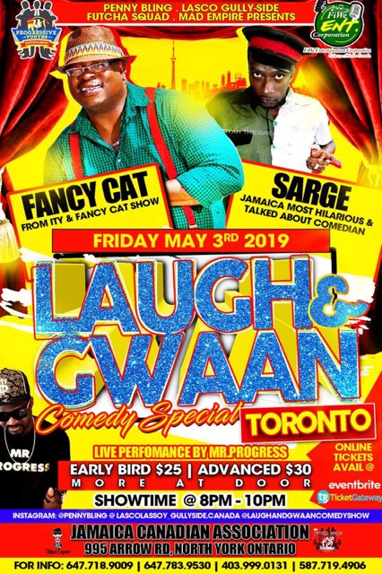 Laugh and Gwaan Comedy Special ft live from Jamaica Fancy Cat and Sarge May 03, 2019 08:00 PM - May 03, 2019 10:00 PM