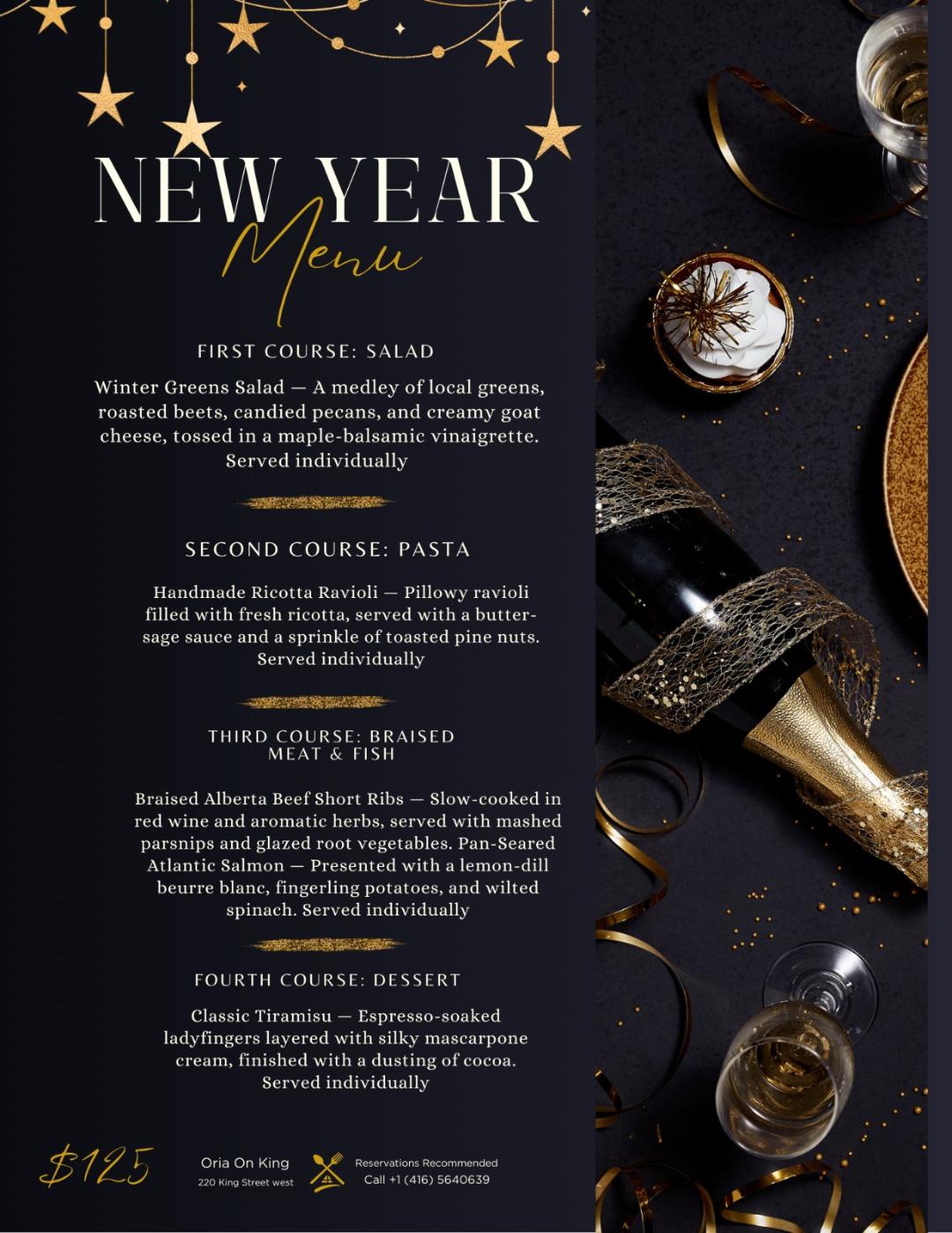 • Braised Alberta Beef Short Ribs — Slow-cooked in red wine and aromatic herbs, served with mashed parsnips and glazed root vegetables.• Pan-Seared Atlantic Salmon — Presented with a lemon-dill beurre blanc, fingerling potatoes, and wilted spinach.• Served individually
