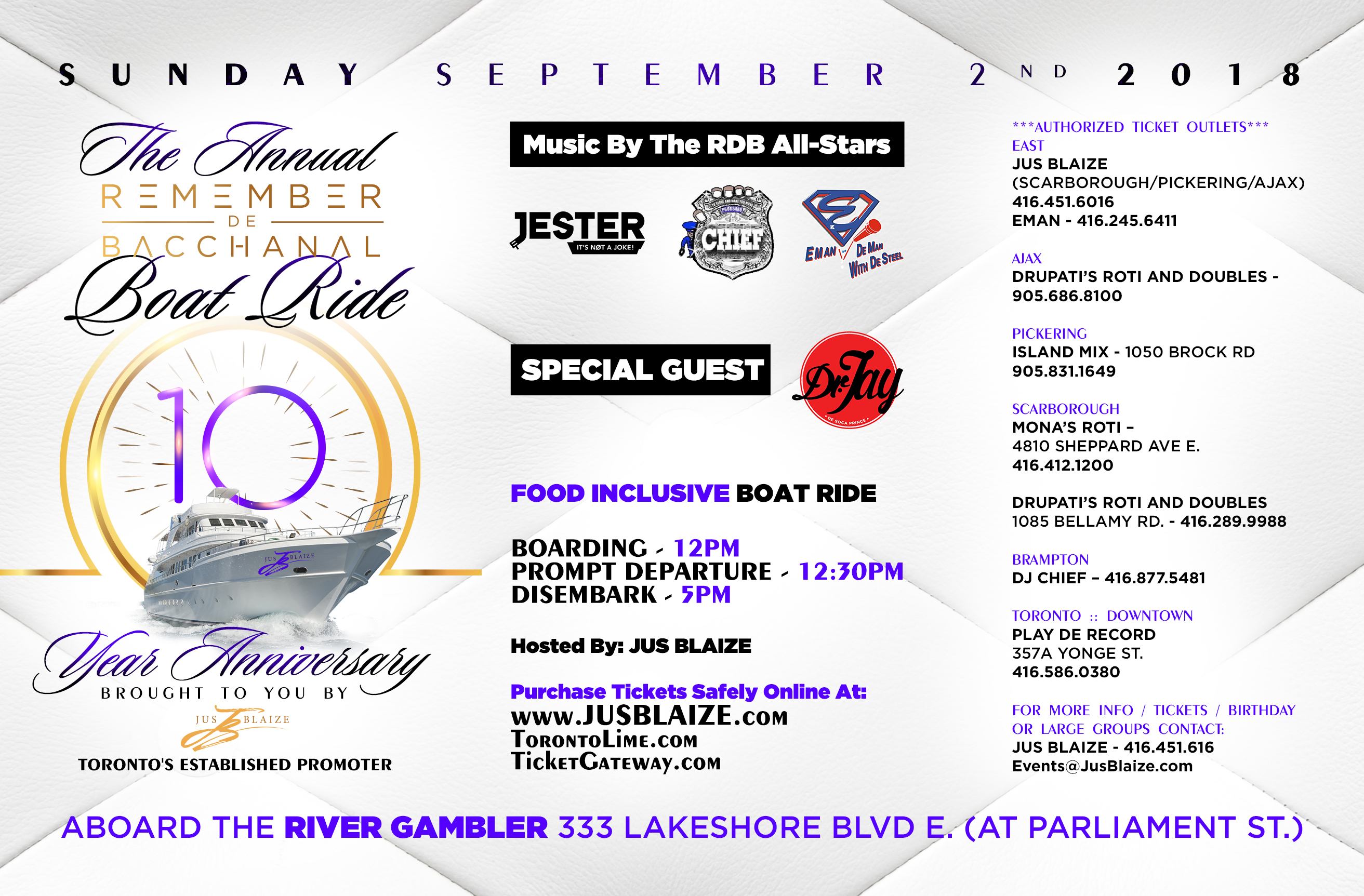 As we celebrate the Toronto Carnival season, and enjoyed an amazing HOT summer. Regrettably we now say bon voyage to “Summer 2018” with our Annual REMEBER DE BACCHANAL 10 YEAR ANNIVERSARY BOAT RIDE.