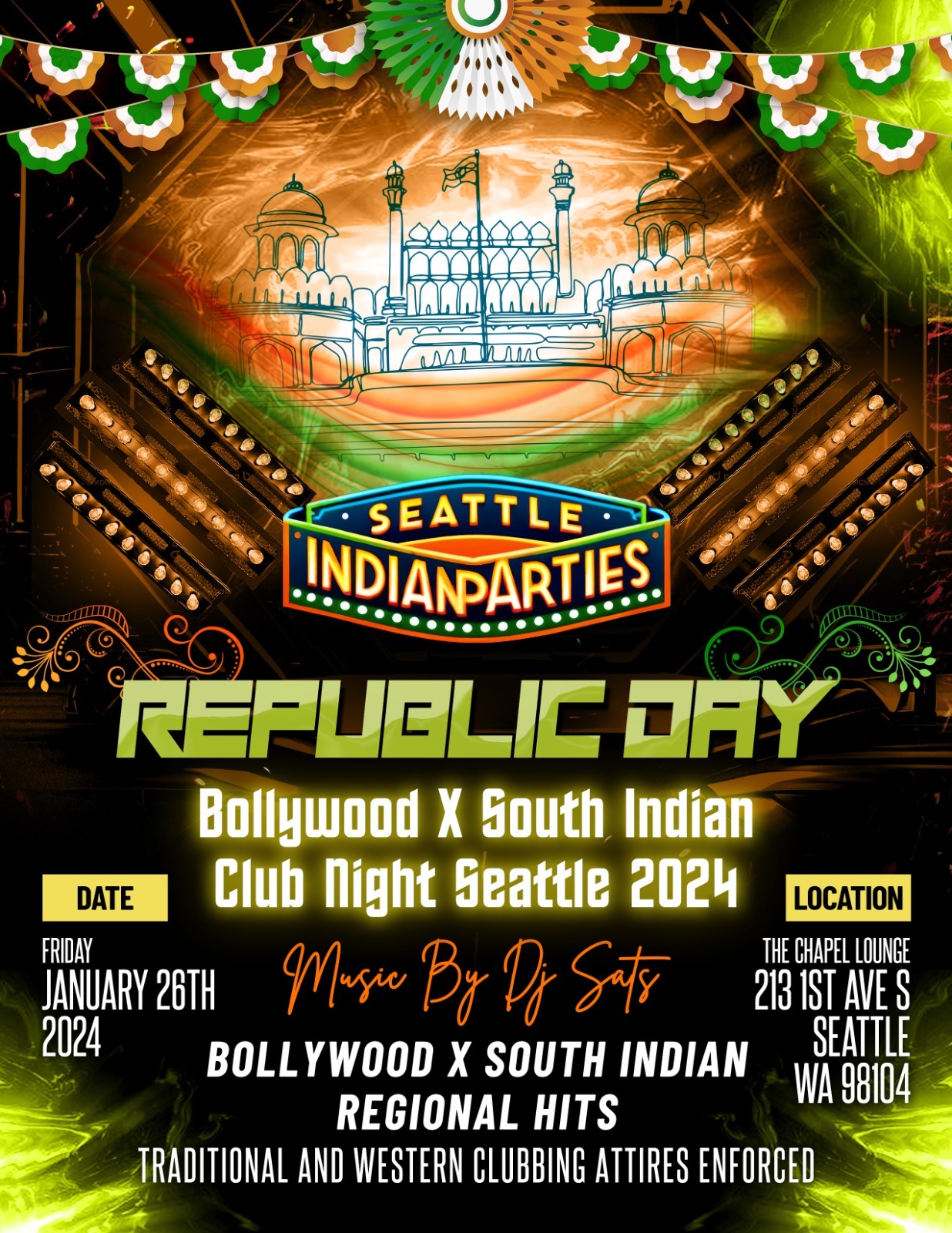 Join us for an unforgettable celebration of India's Republic Day at the hottest fusion event in Seattle! Get ready to be swept away by the magic of Bollywood and South Indian music colliding on the dance floor. Let the dance floor be your stage as we come together to commemorate India's Republic Day in style. Don't miss this unforgettable night of music, dance, and unity! Get ready for a cultural extravaganza like never before. See you on the dance floor!