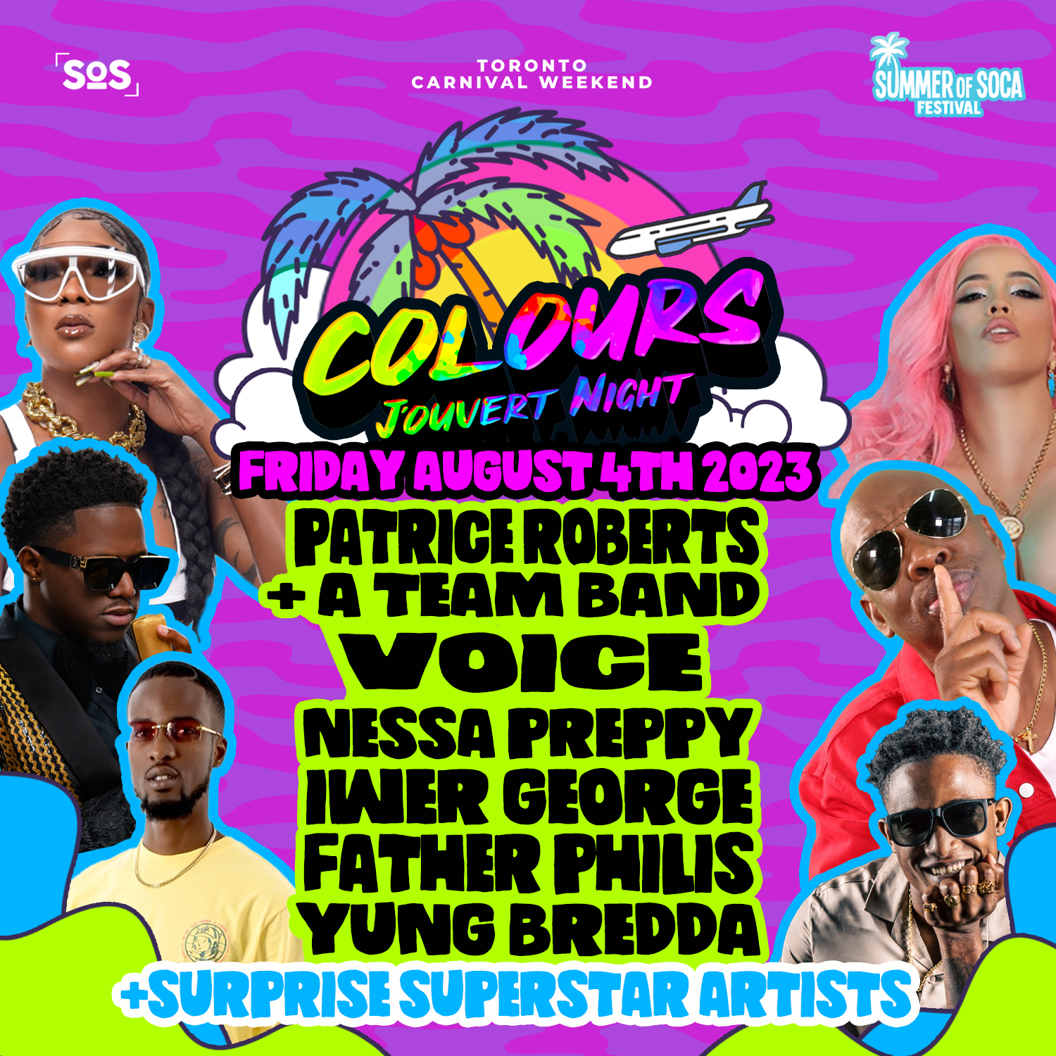Experience the ultimate J'ouvert celebration at COLOURS on Friday, August 4th, where powder and water come together to create a vibrant and immersive experience. Join us as our world-renowned artists take the stage, and get ready to be drenched in a rainbow of colours!