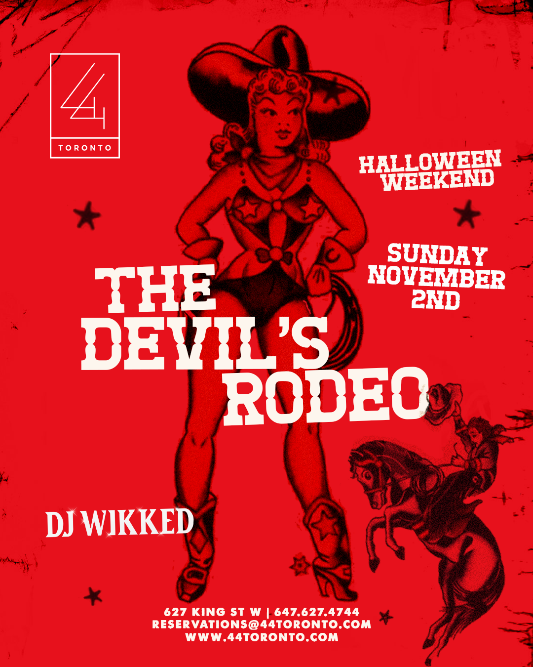 Close out Halloween weekend at 44 Toronto with The Devil’s Rodeo, a high-energy finale that brings together wild west chaos and late-night heat. The venue turns red for the final night of celebration, with DJ Wikked keeping the dance floor alive until the end.