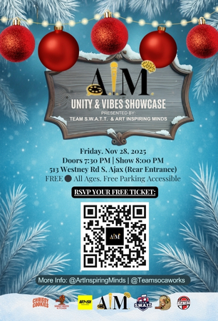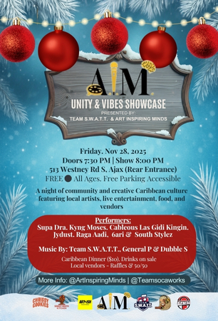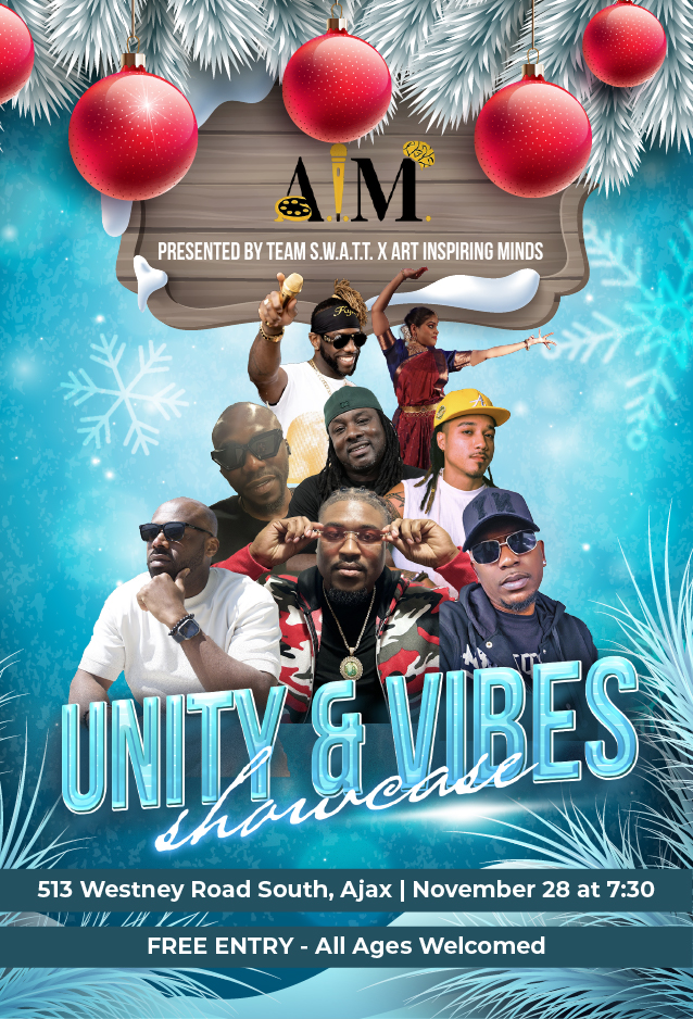 Art Inspiring Minds (A.I.M.), powered by Team S.W.A.T.T., is more than just a showcase — it’s a celebration of community, creativity, and Caribbean culture. The Unity & Vibes Showcase brings together artists, musicians, poets, and performers from across the GTA for an unforgettable night of live entertainment and connection.
