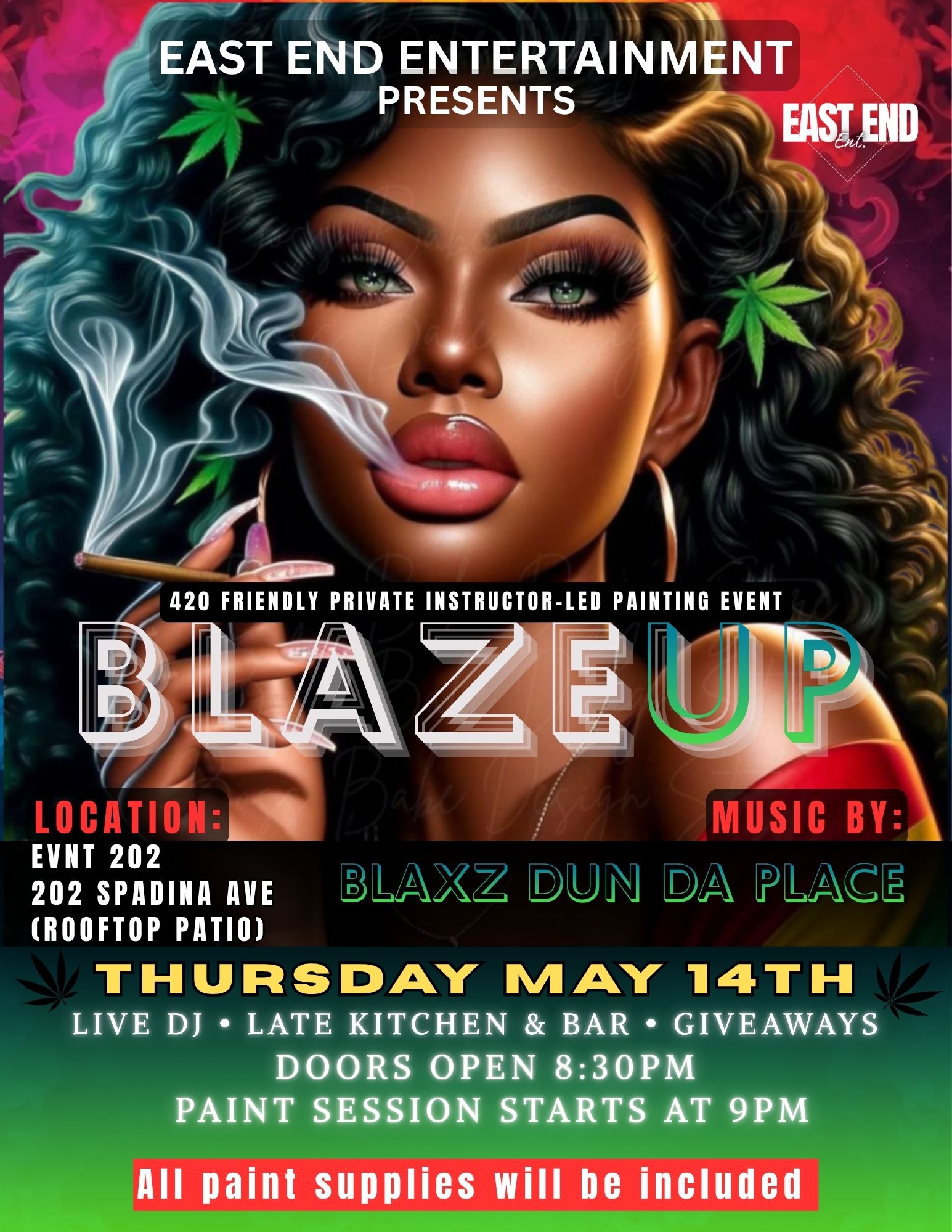 instructor-led private group painting event for all my 420 friendly peeps. Drinks for sale and kitchen is open till late.