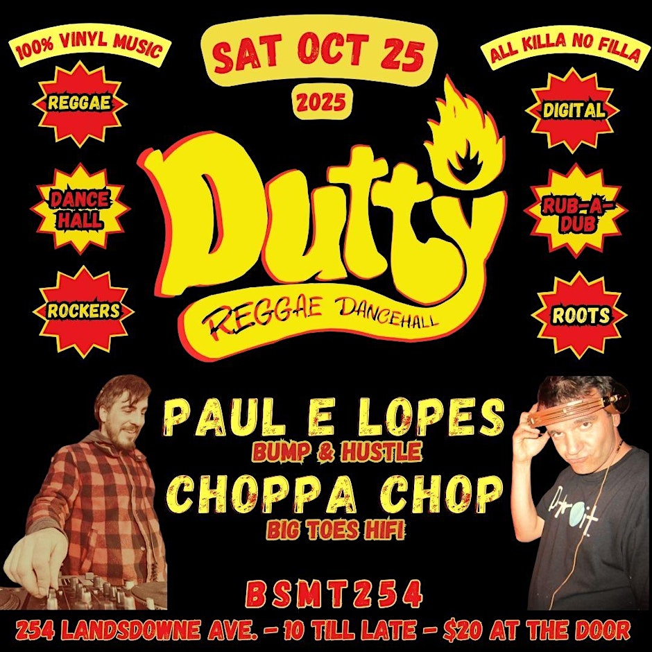 DUTTY REGGAE AND DANCEHALL RETURNS WITH ALL THE HEAT AS HOMETOWN HEROES PAUL E LOPES AND CHOPPA CHOP DIG DEEP IN THEIR CRATES FOR A 100% VINYL EXTRAVAGANZA.