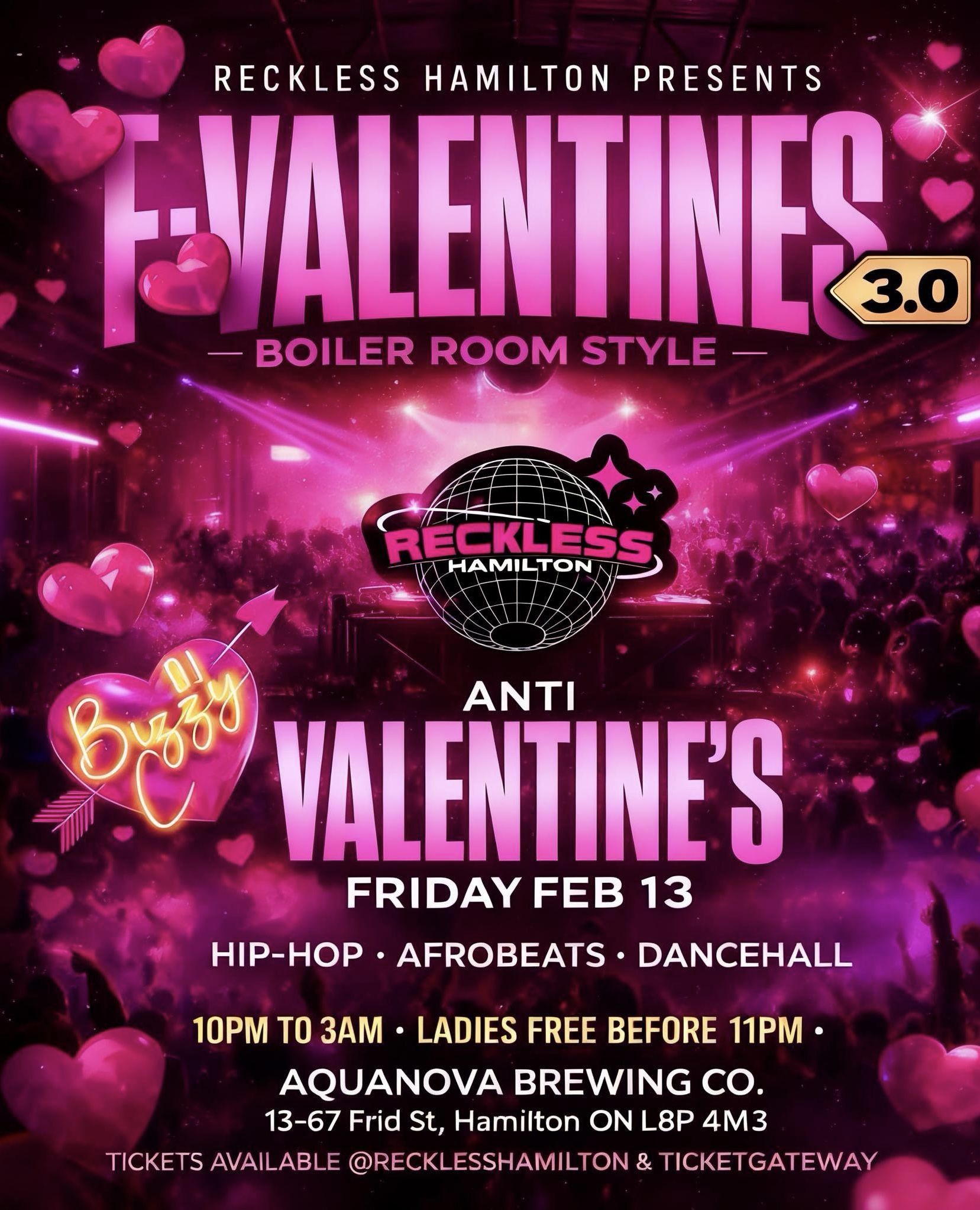 F-VALENTINES is an annual Reckless Hamilton tradition, and it sells out every year. This edition brings a Boiler Room-style setup with DJ Bizzy C leading the night through Hip-Hop, Afrobeats, and Dancehall. Limited space; early tickets strongly recommended.