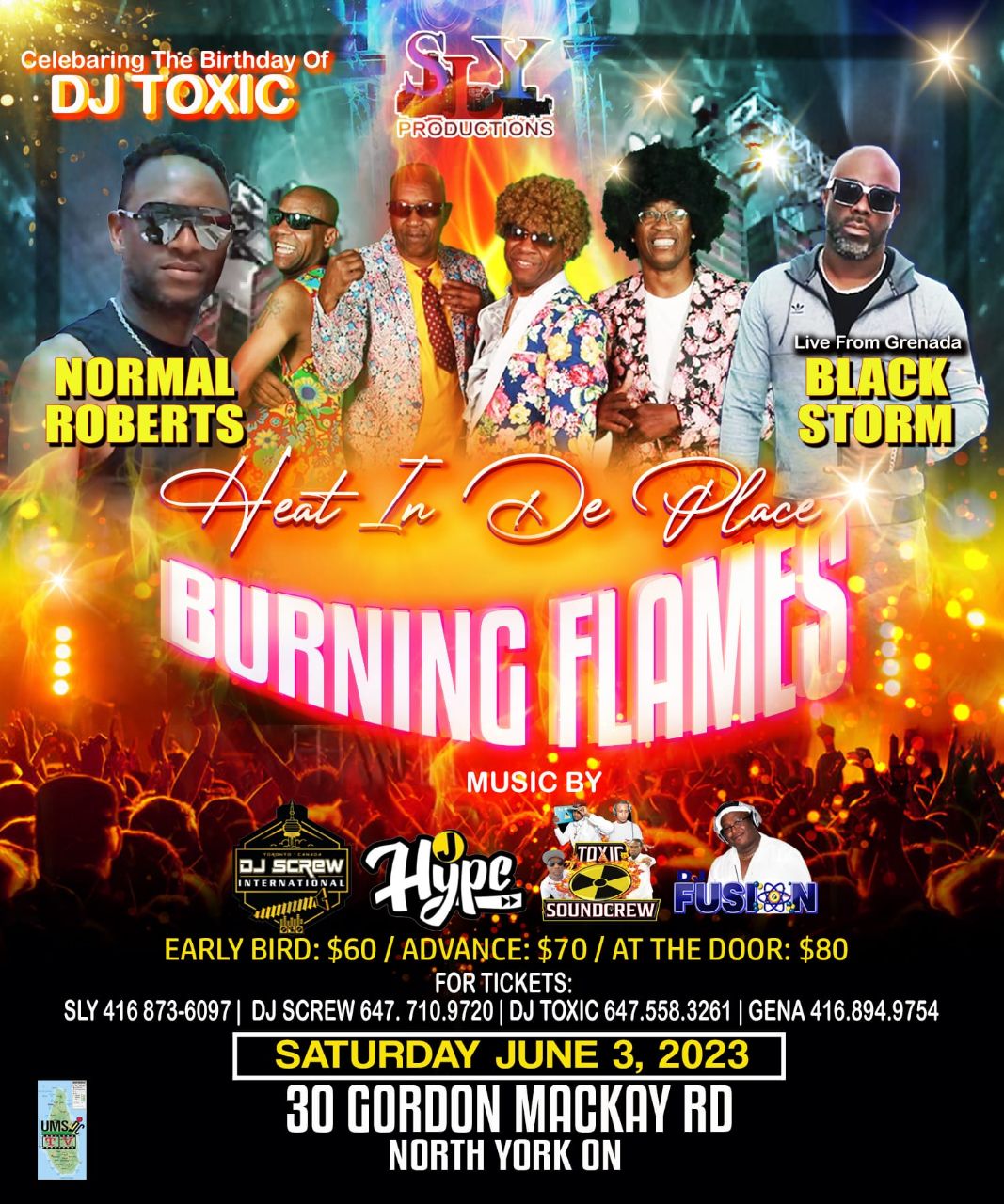 Sly Productions presents Heat In De Place, a Soca concert featuring the legendary Burning Flames band from Antigua along with Black Storm and Normal Roberts. Music by DJ Screw, J Hype, Toxic Soundcrew and Fusion. One night only! The hottest show in Toronto this summer. get your tickets NOW.