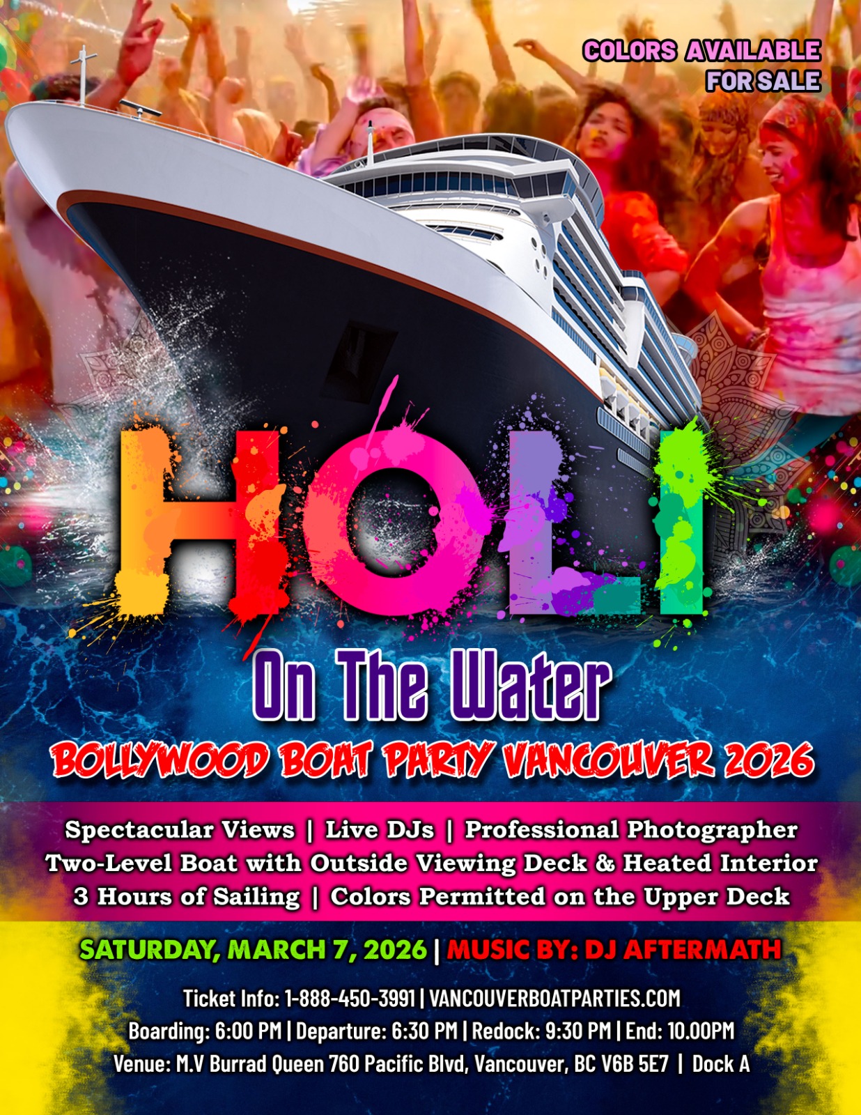 This marks our 6th Annual Holi Boat Party in Vancouver, and once tickets are sold out, there will be no additional releases.
