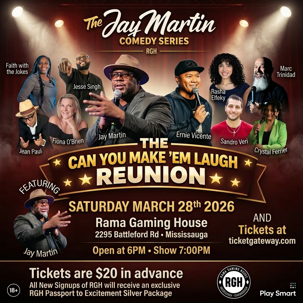 ITS BEEN 10 YEARS SINCE JAY MARTIN HAS SHOWCASED HIS TALENT IN MISSISSAUGA .. HE USE TO HAVE A SHOW CAN YOU MAKE EM LAUGH! SO WE DEICED TO GIVE YOU A REUNION .... $20 TICKETS GETS YOU A SILVER PACKAGE FROM THE GAMING HOUSE THAT VALUES $120 9 COMEDIANS ON THE SHOW GIVES YOU A GREAT LINE UP FOR LAUGHTER
