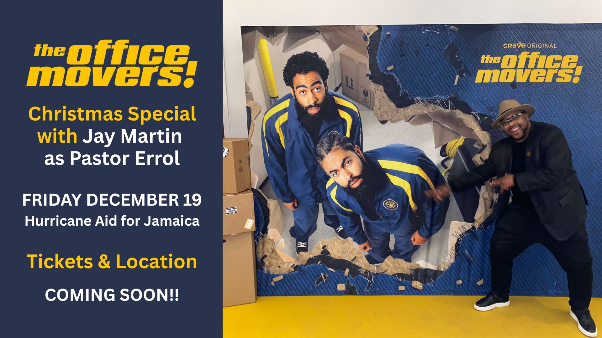 OFFICE MOVERS IS BACK FOR A CHRISTMAS SPECIAL THAT RELEASES ON CRAVE ON FRIDAY DECEMBER 19TH! BUT THIS VIEWING IS GOING TO SPECIAL WITH MUSIC AND COMEDY BY JAY MARTIN WITH ALL PROFITS GOING DIRECTLY TO HELPING HANDS JAMAICA FOR HURRICANE RELIEF... CINESTARZ DELUXE WOODBINE VIP THEATRE ONE NIGHT ONLY! JAY MARTIN LIVE COMEDY AND HIS ACTING DEBUT AS PASTOR ERROL ON THIS SEASON 2 CHRISTMAS SPECIAL. GET YOUR TICKETS NOW. SHOW TIMES ARE ONE HOUR! YOU GET TO LAUGH 4 A CAUSE! 647-828-8674