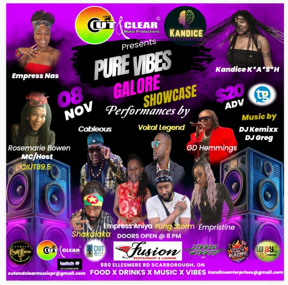 Come join us on November 8, 2025 and fulljoy the vibe at the Pure Vibes Galore Showcase. It will be a fun-filled entertaining night where both local and international artistes will gather under one roof and bring you their pure vibe through their art/craft/gift (Kandice K*A*S*H, Vokal Legend, Empress Aniya, Empristine, Cableous, Yung Storm, Shakalaka, GD Flemming...) Be sure to wear your dancing shoes as DJ Kemixx of Likkle Wikkid Int Sound and DJ Greg of Everblazing Sound entertain you and get your waistline moving, with the latest and the greatest in dancehall, reggae, soca... The event will be hosted by Rosemarie Bowen of CIUT 89.5fm. The event will be held at 880 Ellesmere Rd, Scarborough, Ontario, Canada. Doors open at 8pm, artistes merch will be displayed and available for purchase until 9:30pm, Showtime 10pm. Mark your calendars, get your tickets and bring your friends along. Let's make this night one to remember!
