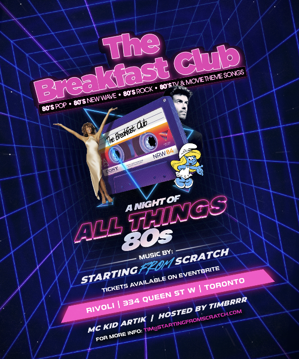 Come join us for a blast from the past at Rivoli Toronto! Get ready to step back into the 80s with our themed event, THE BREAKFAST CLUB. Dust off your leg warmers and tease up your hair for a night filled with neon lights, retro tunes, and all things 80s. Whether you're a child of the 80s or just love the era, this event is sure to transport you back in time. So grab your friends, put on your best 80s attire, and get ready to dance the night away!