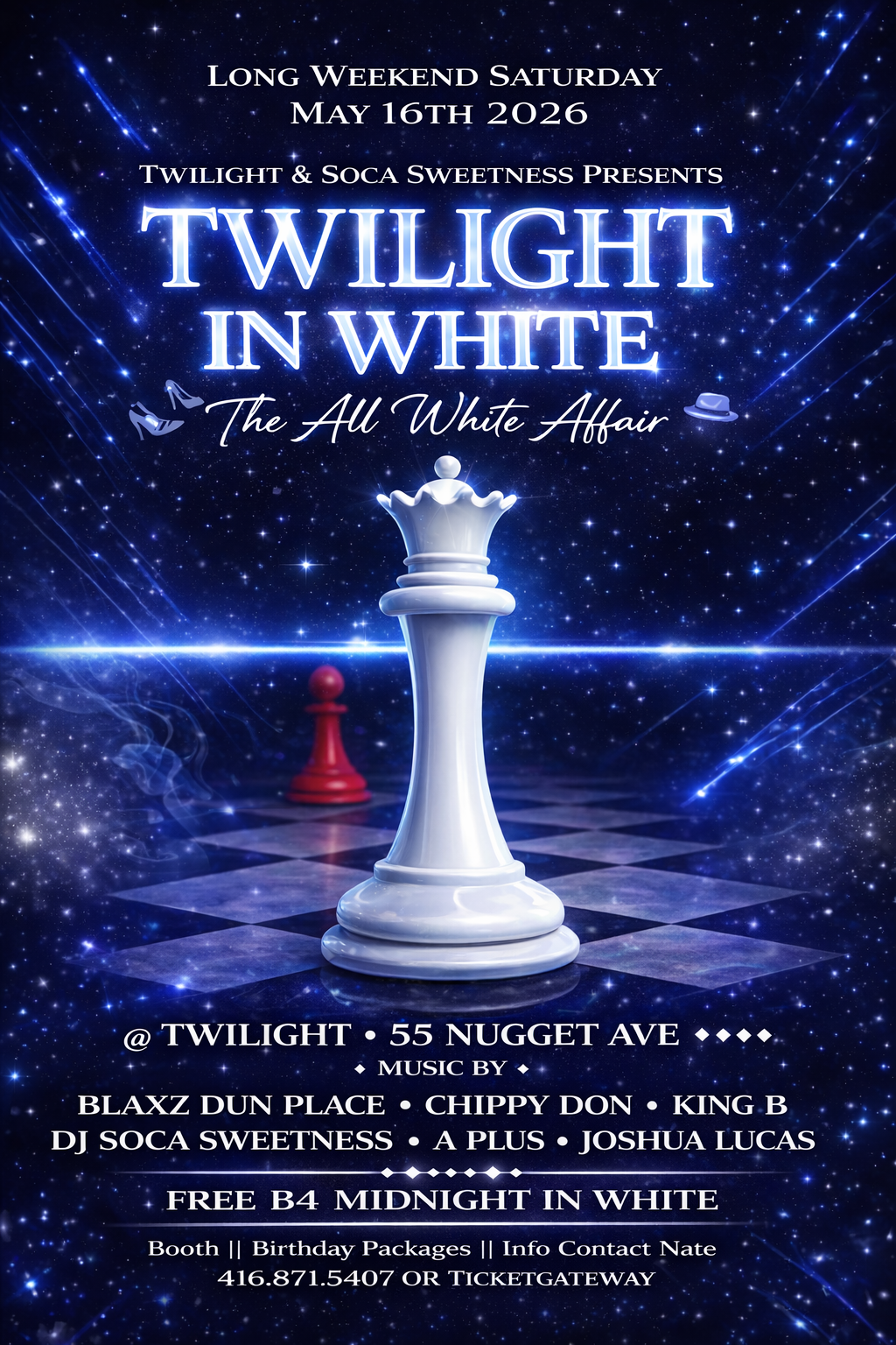 Twilight & Soca Sweetness Presents TWILIGHT IN WHITE The All White Affair @ Twilight- 55 Nugget Ave ●●●●●●●● Music By BLAXZ DUN PLACE CHIPPY DON JOSHUA LUCAS KING B DJ SOCA SWEETNESS A PLUS ●●●●●●●● FREE B4 MIDNIGHT IN WHITE Booth || Birthday Packages || Info Contact Nate 416.871.5407 Or Ticketgateway
